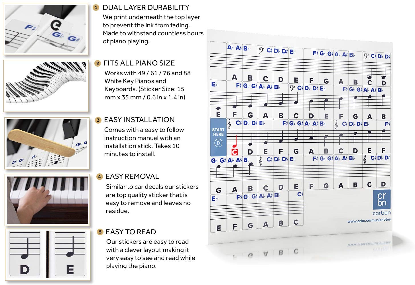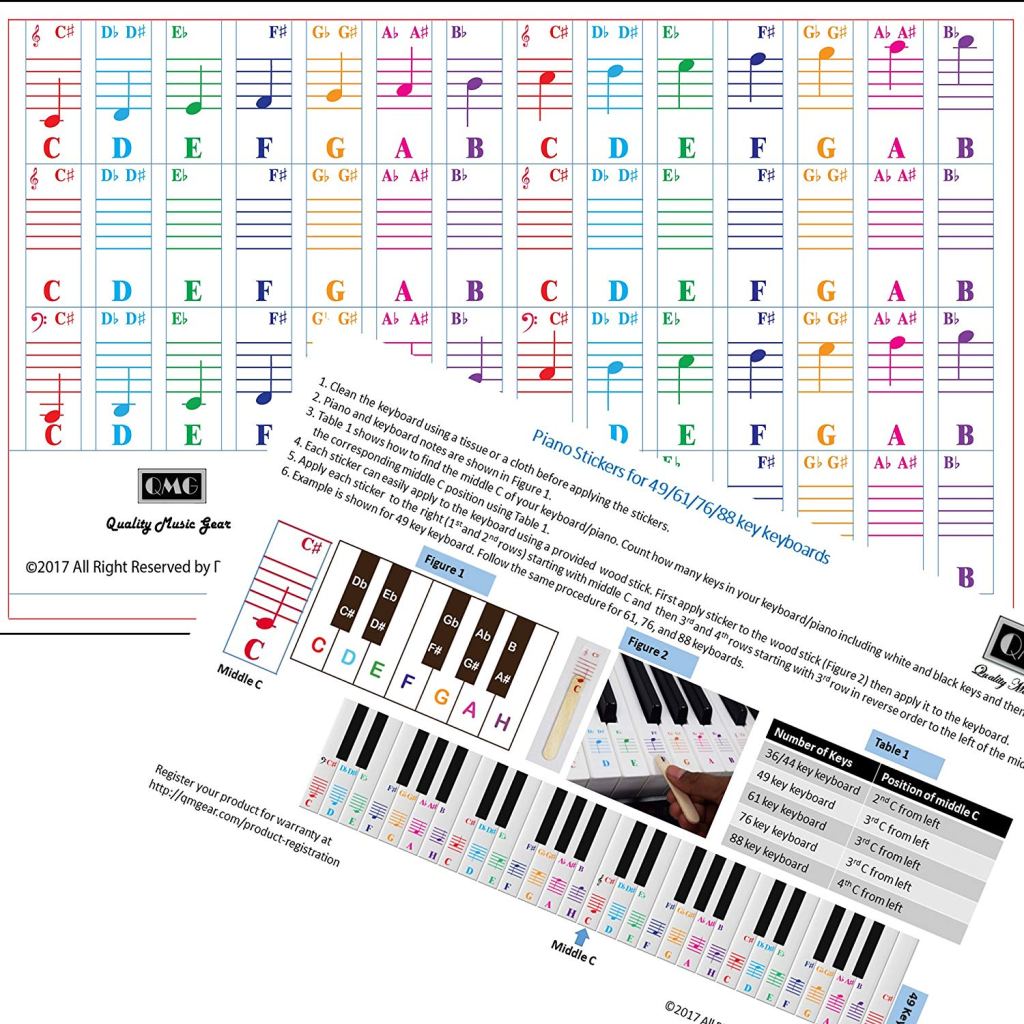 There are two types of sets, lettered and numbered. The letter sets can come with traditional notes. Then there are sets that use numbers, some of these are based on the traditional Chinese method called Jianpu and they use the numbers 1-7. Furthermore there is a new system that is more comprehensive and uses numbers 1-12. We will cover this system in our report along with three other top brands. All four brands say they sell removable piano key stickers and have instructions on how to apply piano keyboard stickers.